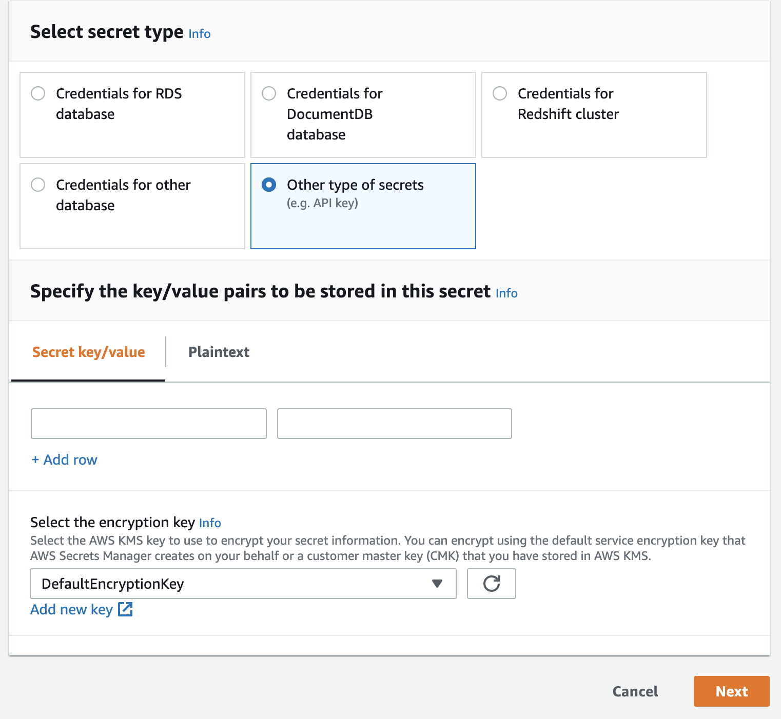Instead of storing API Keys, Secrets, Webhooks etc. in properties files, we will store them in AWS Secrets Manager and use them in our code programmatically. AWS has a nice tutorial on adding secrets to Secrets Manager.