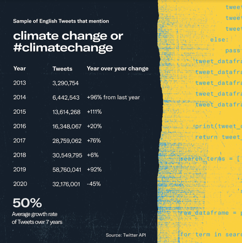 As extreme weather unfolds, people come to Twitter before, during, and after these events to talk about what’s happening. In fact, in a sample of English-language Tweets from 2013 to 2020, mentions of “climate change” grew an average of 50% over the 7 year period measured. This conversation has proven to be powerful and influential, as environmental activists use Twitter to raise awareness about the climate crisis, organize their communities, and connect with others passionate about protecting the planet.