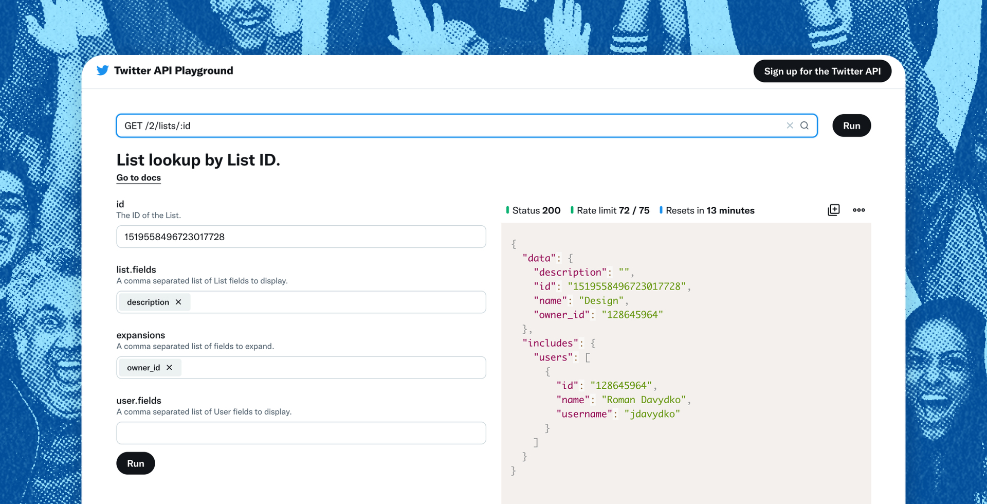 This feature allows you to quickly learn how the Twitter API v2 works, by running real-time endpoint calls from the developer portal. You can now try retrieving Tweets, Lists, Spaces, and more even before you’ve created a Project or app!