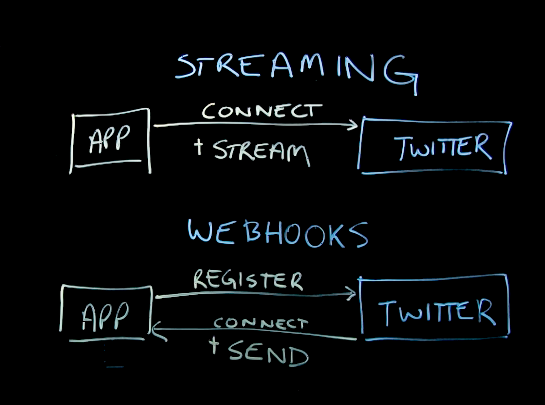 Twitter’s more common APIs are based on a client-server approach, where the developer creates a client application that makes a connection to Twitter’s servers to receive some information. This can be based on a streaming model, where the client connection to Twitter’s servers stays always open to receive data in realtime, or, it can be a client-triggered request, for example if a developer wants to retrieve a specific Tweet object.
