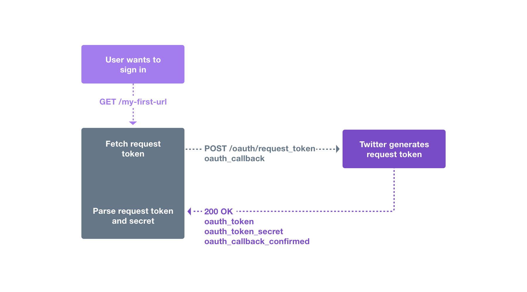 「Twitterでログイン」を実装する3つのステップである、リクエストトークンの取得、ユーザーのリダイレクト、リクエストトークンのアクセストークンへの変換を以下に示します。