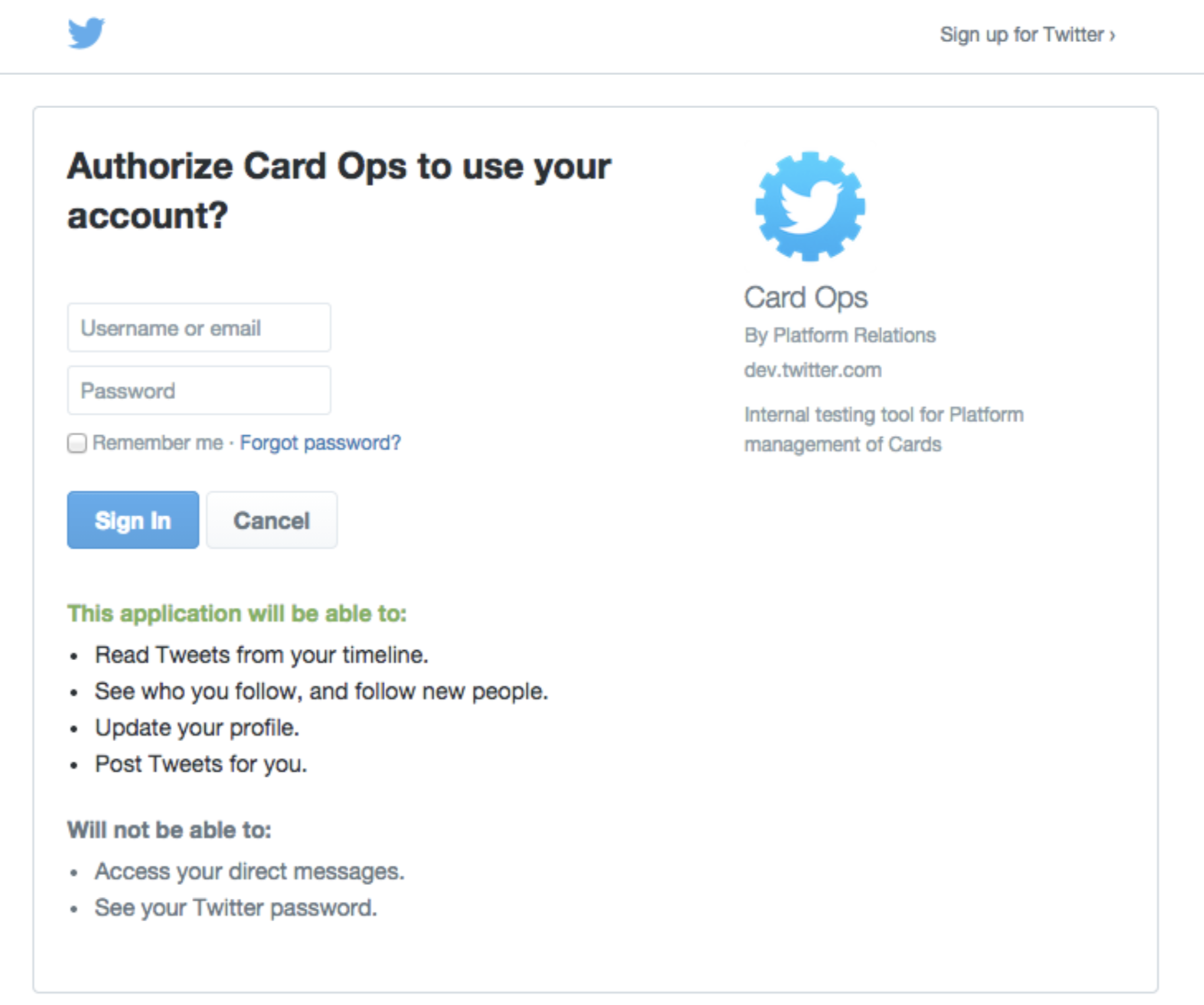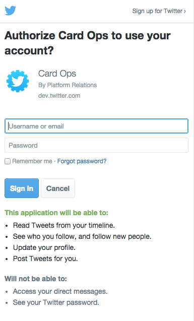 - Twitterとの統合 - 「Twitterでログイン」のフローにより、ユーザーに代わりTwitter APIを使用する承認を付与できます。